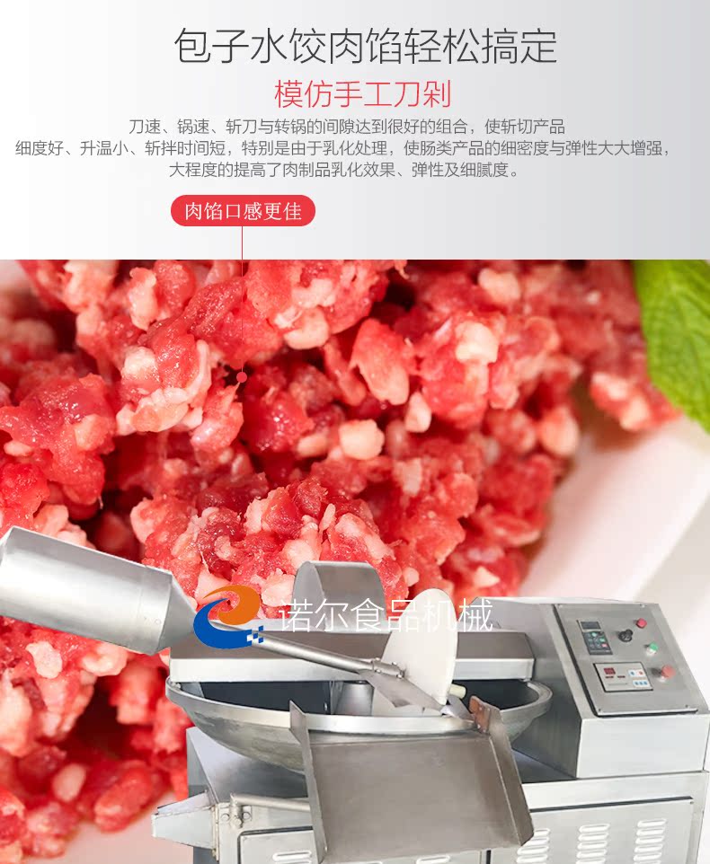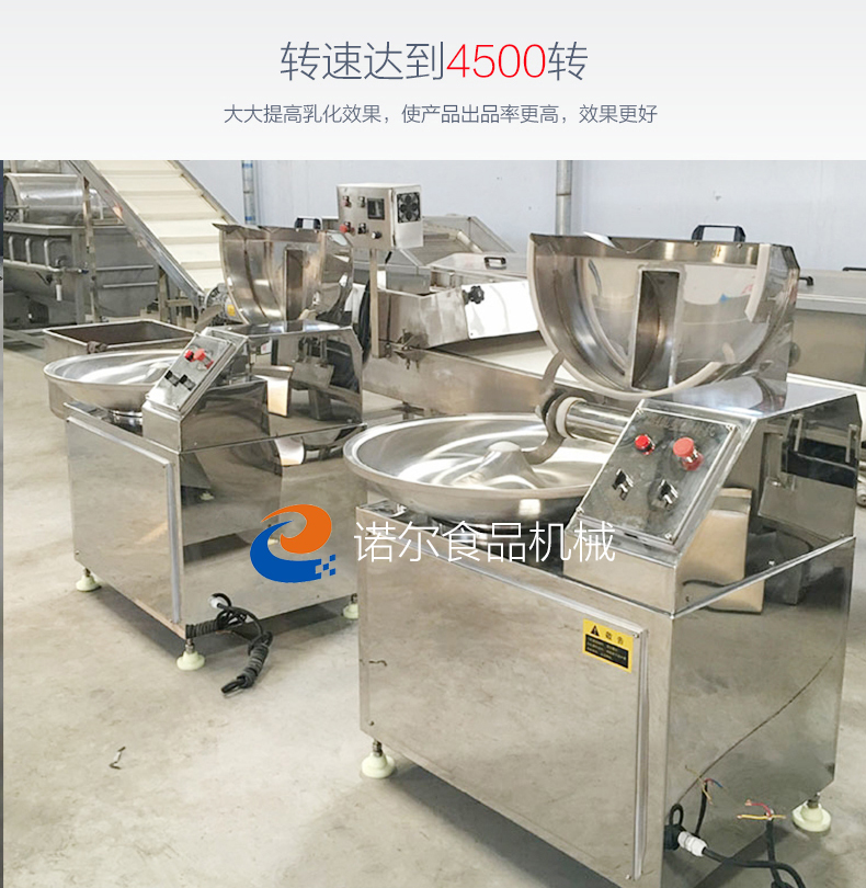 斬拌機(jī)是肉類制品生產(chǎn)制作過程中的一個關(guān)鍵設(shè)備。它不僅能夠?qū)⑷鈮K、碎肉、脂肪等主要原料精細(xì)的切碎,同時還將其它原料如水、冰屑、調(diào)料、附加品同肉末一起攪拌成均勻的乳狀物。根據(jù)不同的要求選擇適當(dāng)?shù)霓D(zhuǎn)速,可以縮短運行時間,減少物料發(fā)熱量,可以保持餡料的天然色澤和風(fēng)味。