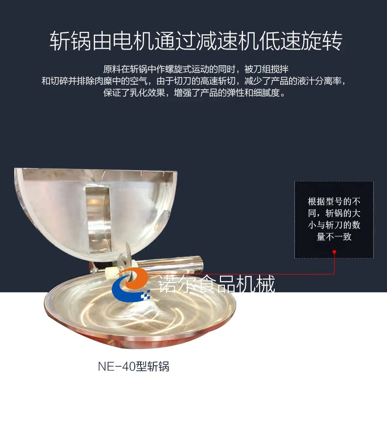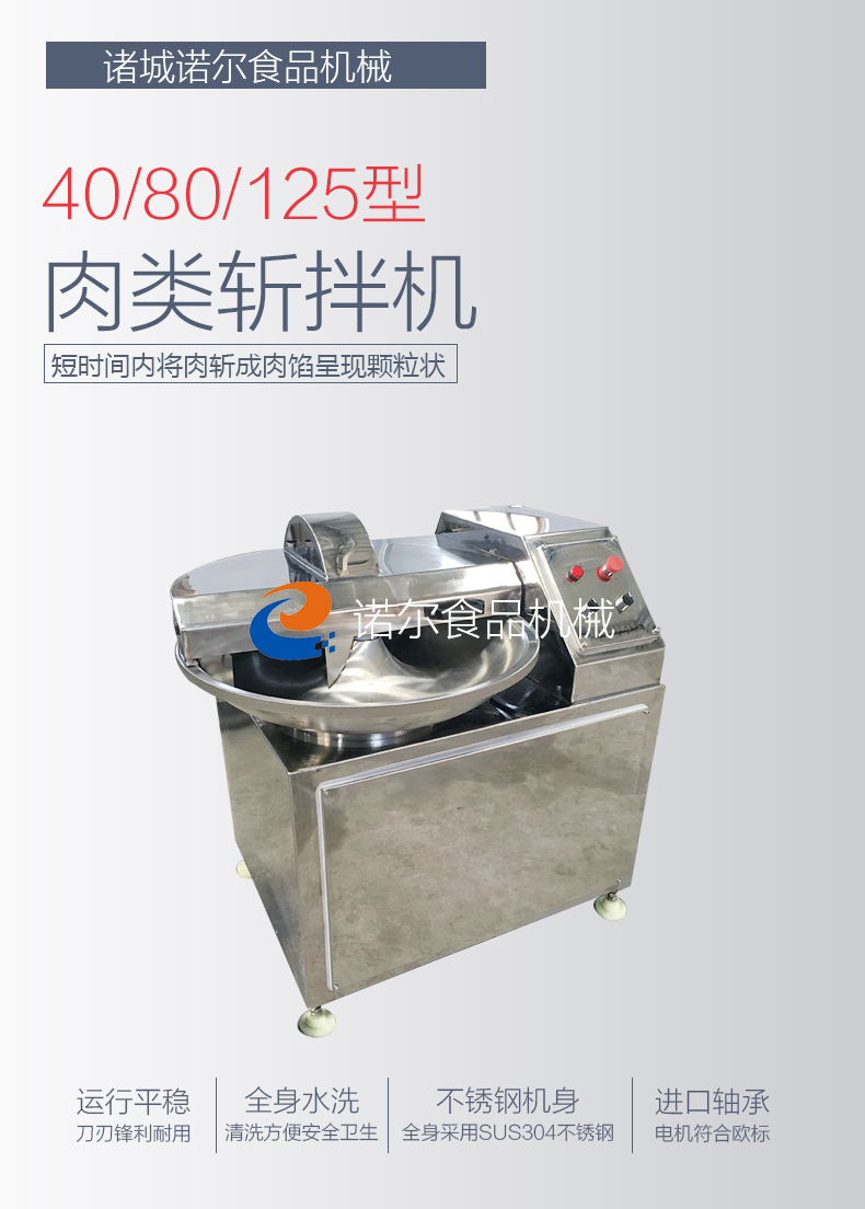 斬拌機(jī)在利用斬刀高速旋轉(zhuǎn)的斬切作用,將肉及輔料在短時間內(nèi)斬成肉餡或肉泥狀,還可以將肉、輔料、水一起攪拌成均勻的乳化物。