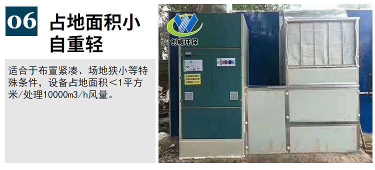 六、設(shè)備占地面積小,自重輕:適合于布置緊湊、場(chǎng)地狹小等特殊條件,設(shè)備占地面積<1平方米/處理10000m3/h風(fēng)量。
