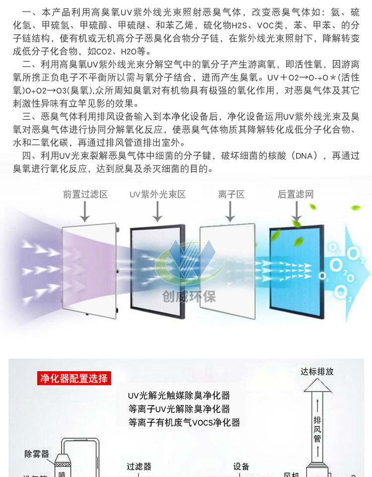 本產(chǎn)品采用高能高臭氧UV紫外線(xiàn)光束、氧化反應(yīng)催化劑、高能離子發(fā)生裝置的組合工藝來(lái)降解有機(jī)廢氣,改變惡臭、刺激型氣體如:氨、三甲胺、硫化氫、甲硫氫、甲硫醇、甲硫醚、二甲二硫、二硫化碳和苯乙烯,硫化物H2S、VOC類(lèi)、苯、甲苯、二甲苯的分子鏈結(jié)構(gòu),使有機(jī)或無(wú)機(jī)高分子惡臭化合物分子鏈,通過(guò)高能紫外線(xiàn)光束照射、催化劑的氧化反應(yīng)、正氧離子的氧化反應(yīng),降解轉(zhuǎn)變成低分子化合物,如CO2、H2O等。