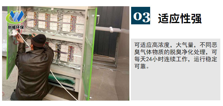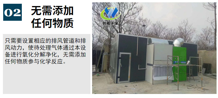 二、無(wú)需添加任何物質(zhì):只需要設(shè)置相應(yīng)的排風(fēng)管道和排風(fēng)動(dòng)力,使惡臭氣體通過(guò)本設(shè)備進(jìn)行脫臭分解凈化,無(wú)需添加任何物質(zhì)參與化學(xué)反應(yīng)。,