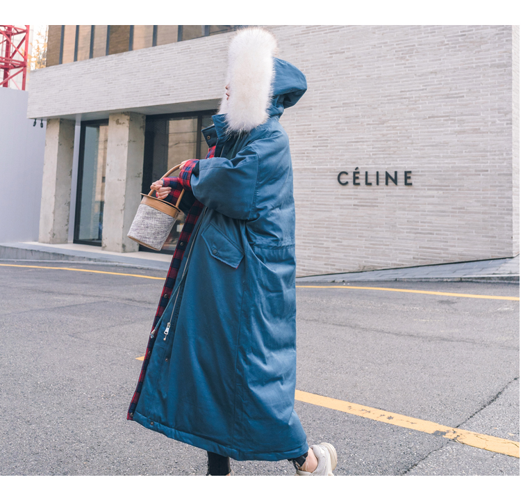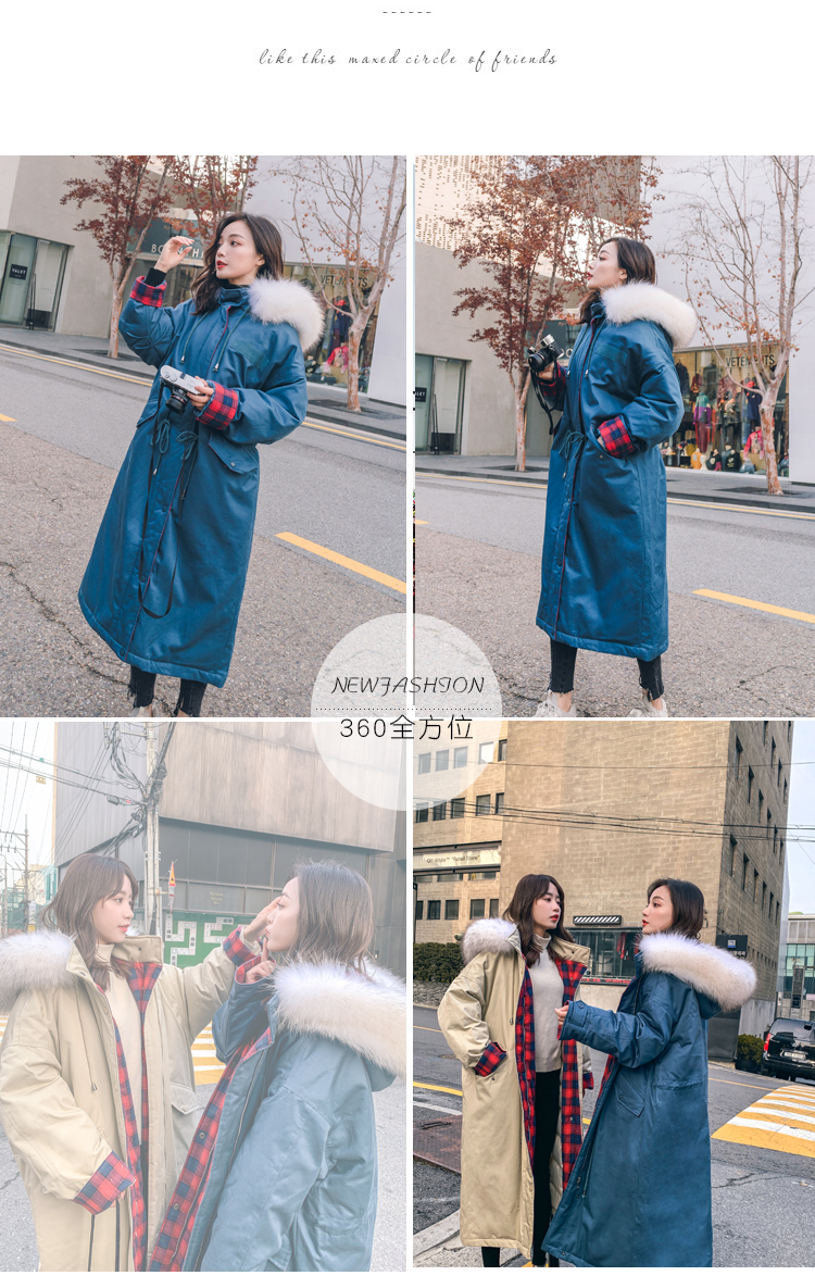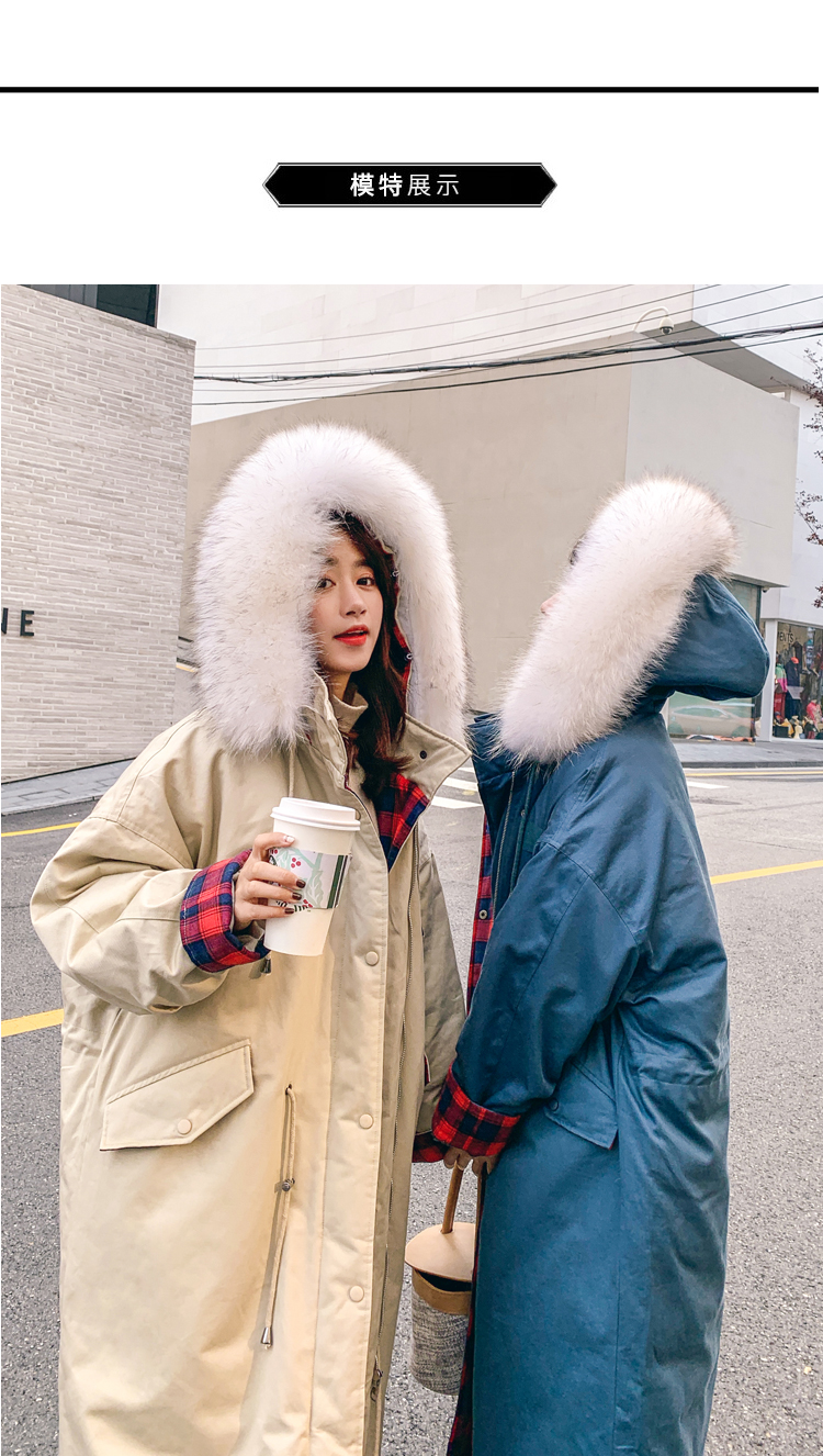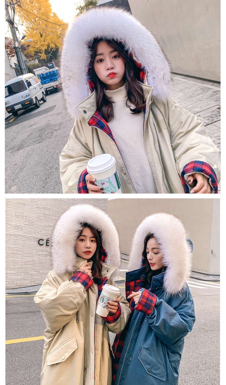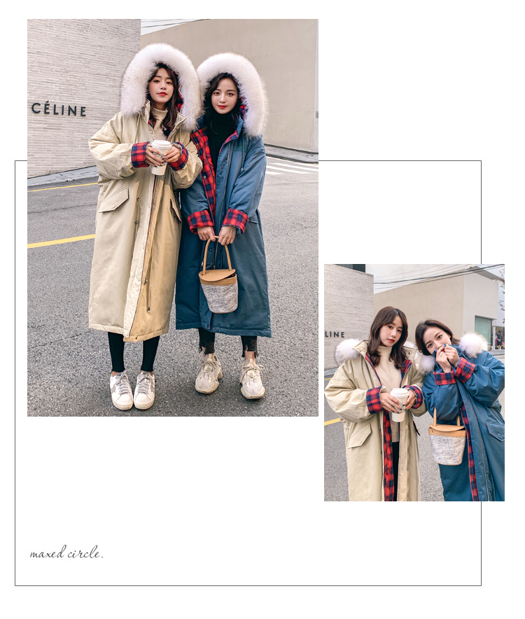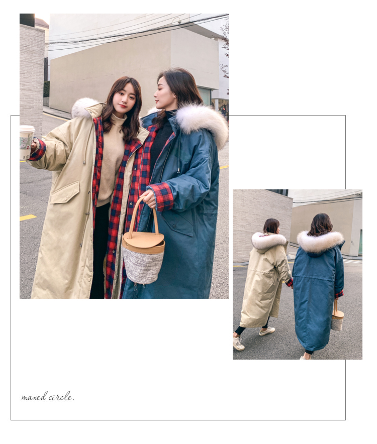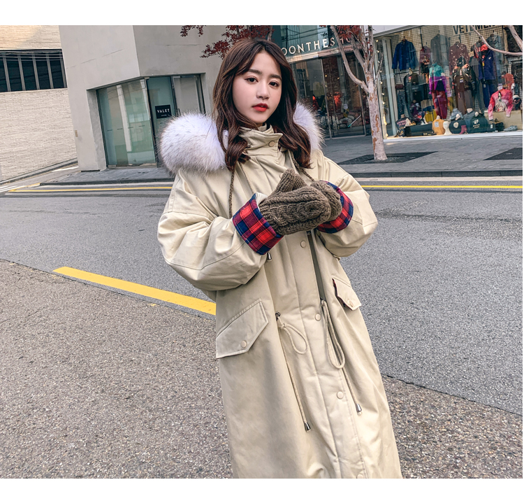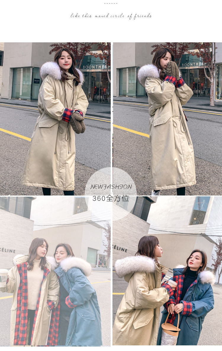 品牌折扣女裝工裝格子羽絨棉衣女冬棉服18新款韓版ins大毛領(lǐng)長款過膝加厚棉襖