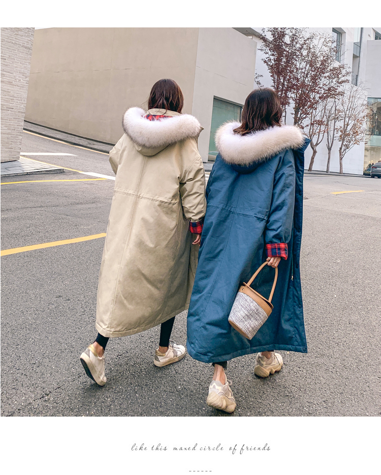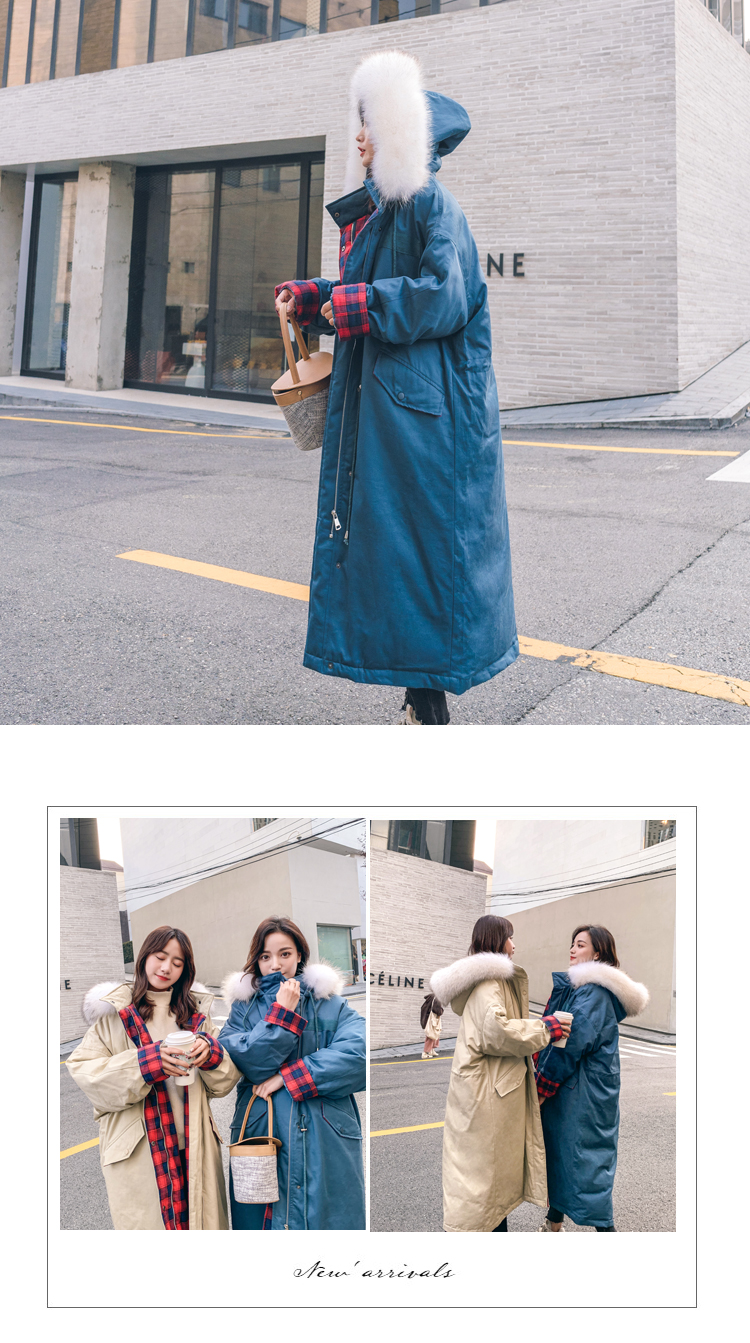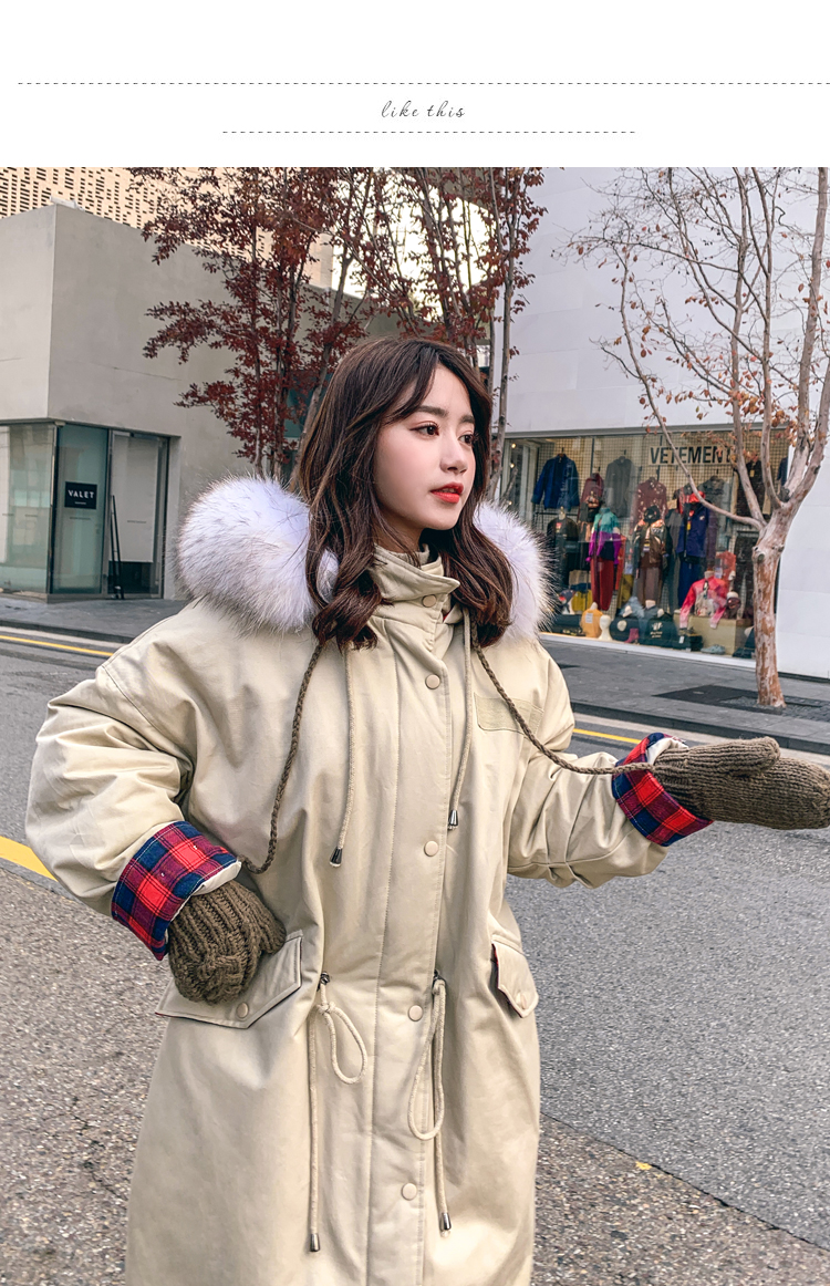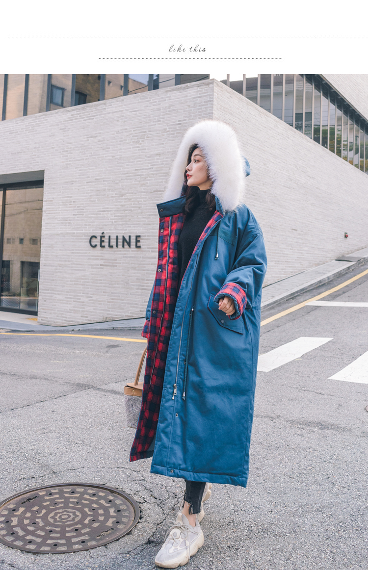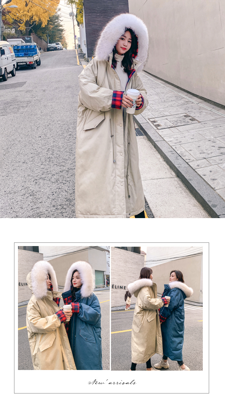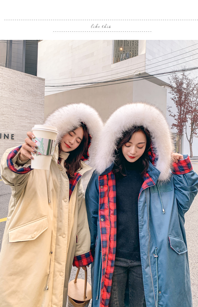 品牌折扣女裝工裝格子羽絨棉衣女冬棉服18新款韓版ins大毛領(lǐng)長款過膝加厚棉襖