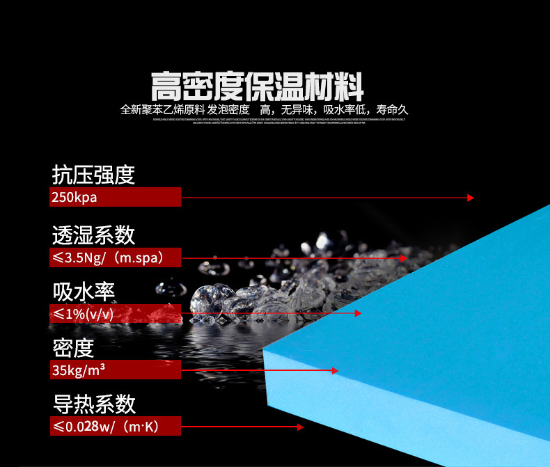 吸水率是衡量保溫材料的一個(gè)重要參數(shù)。保溫材料吸水后保溫性能隨之下降,在低溫情況下,吸入的水 易結(jié)冰,破壞了保溫材料的結(jié)構(gòu),從而使板材的抗壓及保溫性能下降。由于聚苯乙烯分子結(jié)構(gòu)本身不吸水,板材分子結(jié)構(gòu)穩(wěn)定,無間隙,解決了其它材料漏水、滲透、結(jié)霜、冷凝等問題。