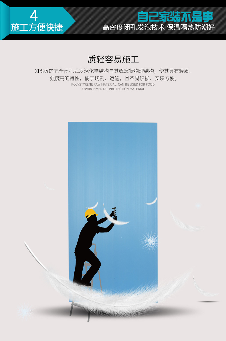 XPS板的完全閉孔式發(fā)泡化學(xué)結(jié)構(gòu)與其蜂窩狀物理結(jié)構(gòu),使其具有輕質(zhì)、高強(qiáng)度的特性,便于切割、運(yùn)輸,且不易破損、安裝方便。