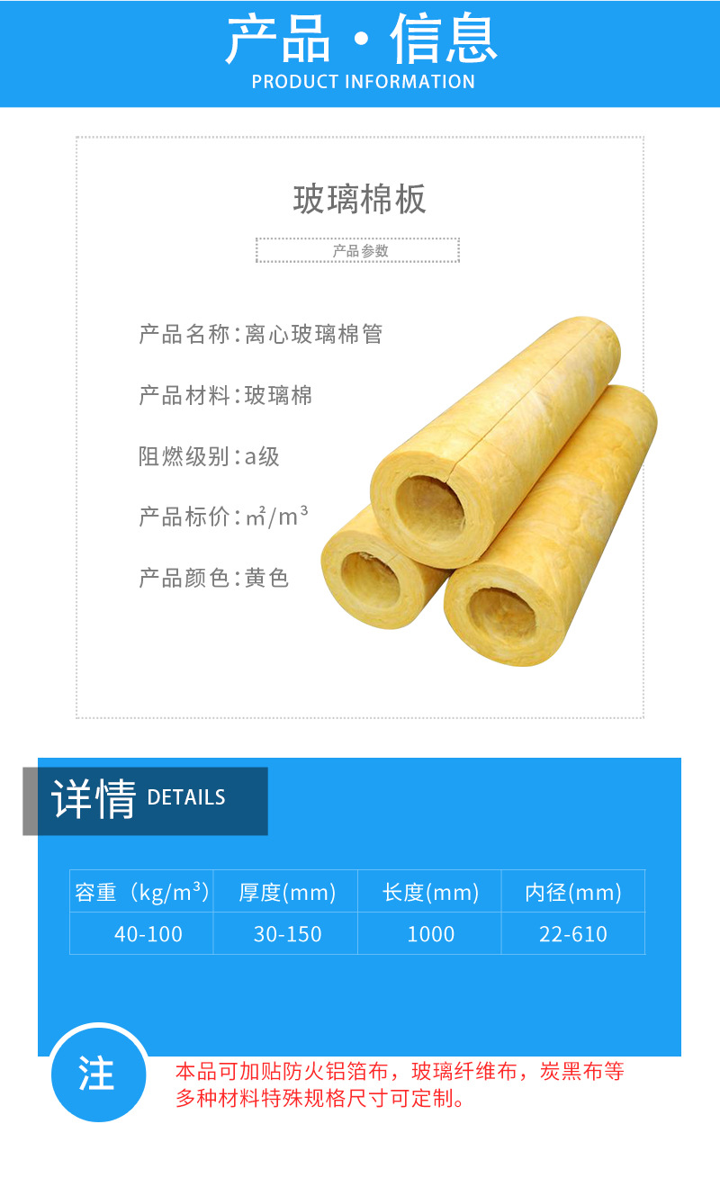 玻璃棉管使用不同容重的玻璃棉疊和在一起,形成容重逐漸增大的形式,可以獲得更大的吸聲效果。例如將一層2.5cm厚24kg/m3的棉板與一層2.5cm厚32kg/m3的棉板疊和在一起的吸聲效果要好于一層5cm厚32kg/m3的棉板。將24kg/m3的玻璃棉板制成1m長的斷面為三角型的尖劈,材料面密度逐漸增大,平均吸聲系數(shù)可接近于1。玻璃棉是用獨有的離心技術(shù),將熔融玻璃纖維化并加以熱固性樹脂為主的環(huán)保型配方粘結(jié)劑加工而成的制品,是一種由直徑只有幾微米的玻璃纖維制作而成的有彈性的玻璃纖維制品,并可根據(jù)客戶不同的使用要求選擇防潮貼面在線復(fù)合. 因其具有大量微小的空氣空隙,使其起到保溫隔熱、吸聲降噪及安全防護等作用,是建筑保溫隔熱、吸聲降躁的材料。獨特優(yōu)點· 獨特技術(shù),壓縮包裝后回彈率為99.2% 。