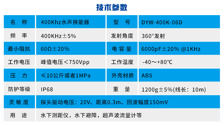 宇征400khz超聲波水下避障傳感器換能器DYW-400K-06D壓電陶瓷水聲換能器