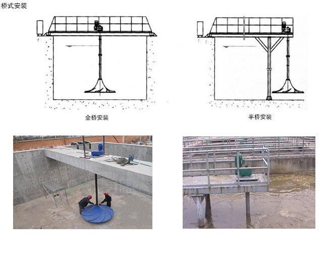 G/QSJ型系列雙曲面攪拌機整機由驅(qū)動裝置和雙曲面葉輪體及安裝附件組成,為了滿足用戶不同工況條件下的使用,安裝分為干式(也稱立軸式)和潛水式兩種。干式安裝,將驅(qū)動裝置固定在工作橋上,通過傳動軸將動能傳至介質(zhì)中的葉輪部件,它用于含固率高,水溫高,含有磨蝕性的液體中,由于葉輪具有自動糾偏功能,運行較平穩(wěn),減速機噪音小于60分貝。潛水式安裝,可免去橋架,采用潛水動力,利用設備自重定位,安裝靈活方便,適用在水深較深,且水質(zhì)穩(wěn)定,不含磨蝕性的水體,水溫不大于40℃,PH值6~9之間,其特點是無噪音,無視覺障礙。