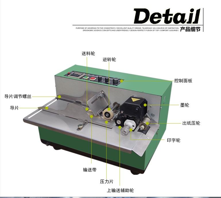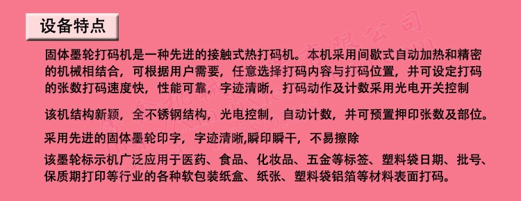 自動紙盒生產(chǎn)日期打碼機結(jié)構(gòu)新穎,全不銹鋼結(jié)構(gòu),光電控制,自動計數(shù),并可預(yù)置押印張數(shù)及部位。采用先進的固體墨輪印字,字跡清晰,瞬印瞬干,不易擦除。鋼印與墨輪印字兩用。
