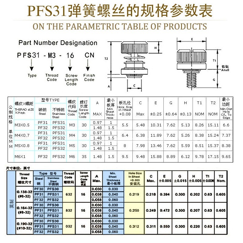 鍍鎳松不脫彈簧螺釘機柜面板緊固件鈑金粵螺手擰螺絲PF31/PF32-M3M4M5