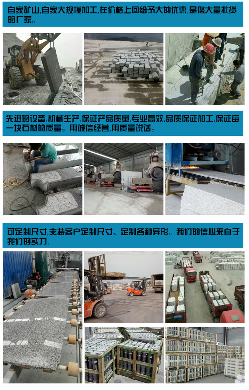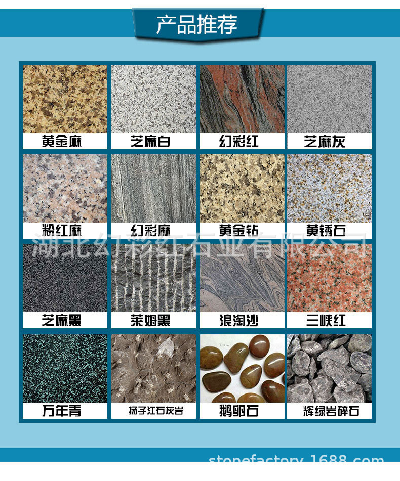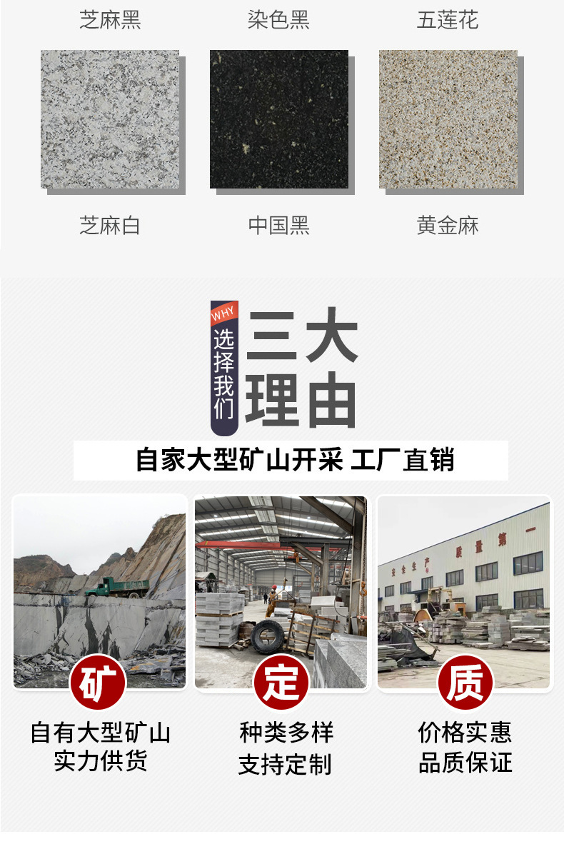 主營產(chǎn)品: 芝麻灰, 芝麻白, 黃金麻, 中國黑, 浪淘沙, 夜里雪, 幻彩紅, 黃銹石, 天山紅, 木蘭紅, 珍珠藍, 浪花白, 青石, 鵝卵石, 黑洞石, 馬蹄石, 路沿石, 粉紅麻, 輝綠巖, 萬年青, 魯灰, 桐梓黑, 芝麻黑, 五蓮花