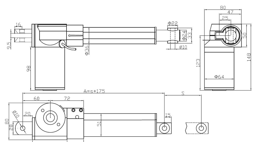 4.最短安裝距(內(nèi)管完全收回來前后兩孔中心距離):L=S(行程)+175mm;內(nèi)管完全伸出去前后兩孔中心距離=2*S(行程)+175mm