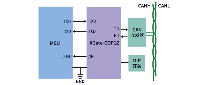 XGate-COP12通信模塊是一款使用簡單方便的CANopen從站模塊,模塊內(nèi)部已經(jīng)固化了CANopen從站協(xié)議棧,使用致遠電子的簡單串口通信協(xié)議就能實現(xiàn)與XGate-COP12的通信,如下圖所示: