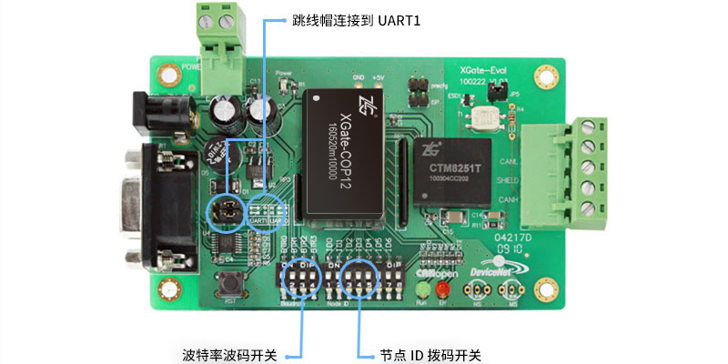 如圖所示,為XGate-COP12評估板。用戶可以通過RS232串口直接對模塊操作。CTM8251T為致遠電子生產(chǎn)的帶2500VDC隔離的CAN收發(fā)器模塊。