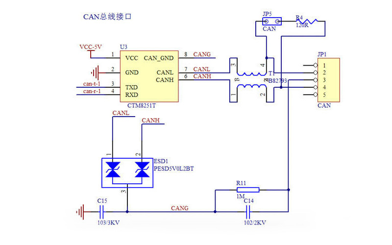 按致遠電子推薦的CAN收發(fā)電路設(shè)計,可達2500VDC電氣隔離CAN接口,靜電等級接觸放電±8KV。