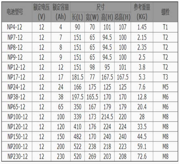 英飛科電蓄電池規(guī)格型號(hào)尺寸: