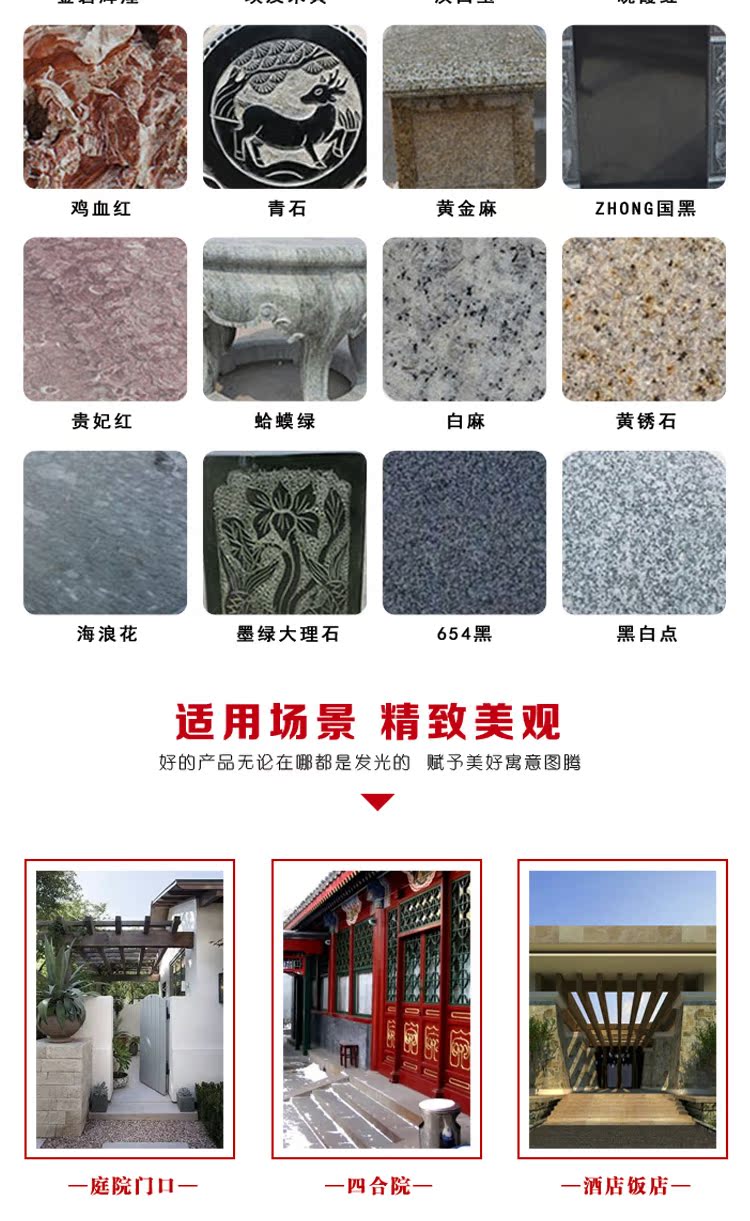 石雕擺件:石桌椅、石凳子、石燈、長廊、抱鼓石、門墩、噴泉、花瓶、香爐、假山、石鼎等。