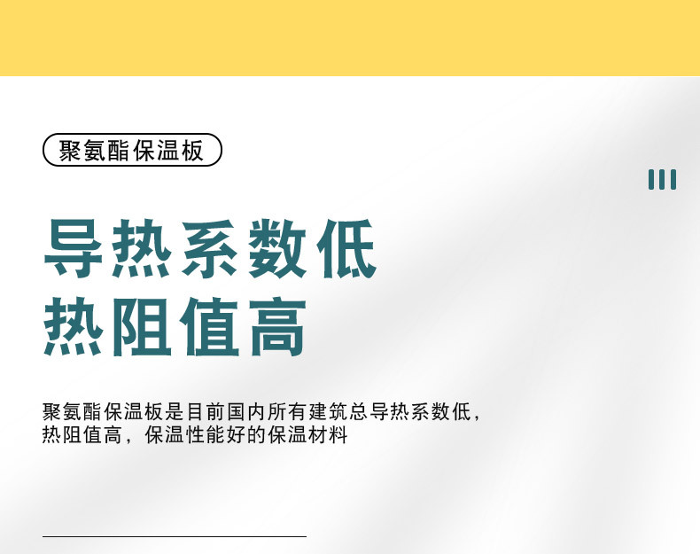 聚氨酯保溫板1.導熱系數(shù)極低,保溫效果好。聚氨酯硬泡導熱系數(shù)為≤0.021W/m·K,是一種非常好的建筑節(jié)能材料,具有優(yōu)異的保溫隔熱性能。在同樣保溫效果下,25mm厚的百美聚氨酯硬質泡沫保溫層,其保溫效果相當于40mm厚的EPS,45mm厚的礦棉.