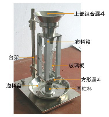 測量原理:將粉末放入上部組合漏斗中的篩網(wǎng)上,自然或靠外力流入布料箱,交替經(jīng)過布料箱中的四塊傾斜的角度為25°的玻璃板和方形漏斗,最后粉末以松散狀態(tài)流入已知體積(25cm3)的圓柱杯中,然后稱量圓柱杯中金屬粉末的質(zhì)量,用粉末的質(zhì)量除以圓柱杯的體積,即得到該粉末的松裝密度值