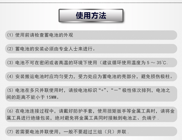 ● 搬運(yùn),安裝,使用過程中應(yīng)避免電池正,負(fù)極短路。