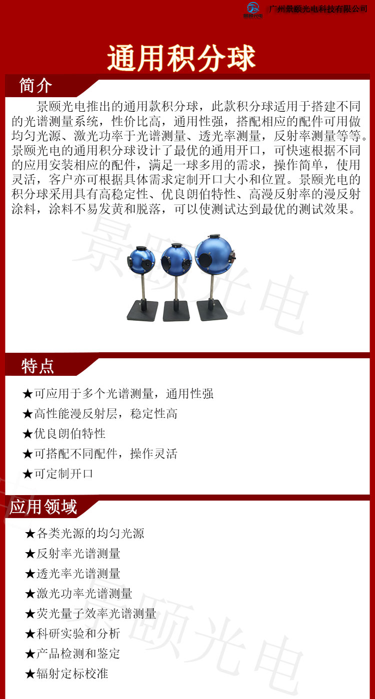廣州景頤光電科技有限公司憑借完善的售前服務(wù)贏得了國內(nèi)外客戶的信任和好評(píng),中國及。公司堅(jiān)持技術(shù)創(chuàng)新,注重質(zhì)量管理,不斷提高服務(wù)水平,確保公司業(yè)務(wù)發(fā)展良好。年產(chǎn)品生產(chǎn)銷售經(jīng)驗(yàn),科學(xué)管理開發(fā)設(shè)計(jì)人才,打造高科技高精度美觀的產(chǎn)品,受到全世界用戶的信任和好評(píng)。INTRT系列積分球具有廣泛的光譜范圍,包括UV-VIS-NIR00-2500nm).INTRT系列集成球采用進(jìn)口PTFE材料,在200-2500nm范圍內(nèi)提供超高反照率.INTRT系列集成球可測(cè)量反射透明度熒光和輻射光譜,廣泛應(yīng)用于各個(gè)部門。