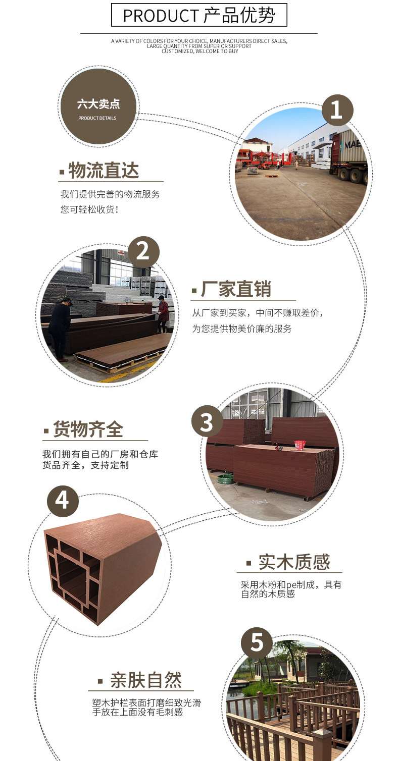 (8)不龜裂,不膨脹,不變形,無(wú)需維修與養(yǎng)護(hù),便于清潔,節(jié)省后期維護(hù)和保養(yǎng)費(fèi)用,使用壽命是普通木材的10倍,是戶外防腐木的替代品。