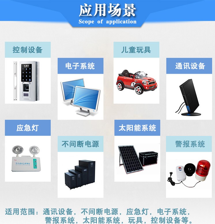 適用范圍 UPS計算機后備應(yīng)急電源 船舶醫(yī)療設(shè)備 消防警報系統(tǒng) 通訊電力系統(tǒng)