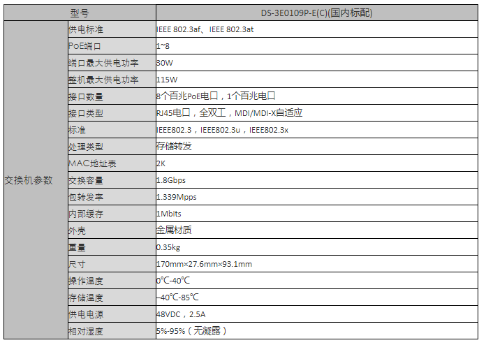 DS-3E0109P-S非網(wǎng)管POE交換機支持8口百兆PoE電口,可通過網(wǎng)線直接供電,PoE自適應802.3af(15.4W)和802.3at(30W)標準,整機PoE輸出功率為120W,通過普通的5類雙絞線即可為AP、IP攝像頭、IP電話等PoE受電設備同時傳輸電力和數(shù)據(jù)。