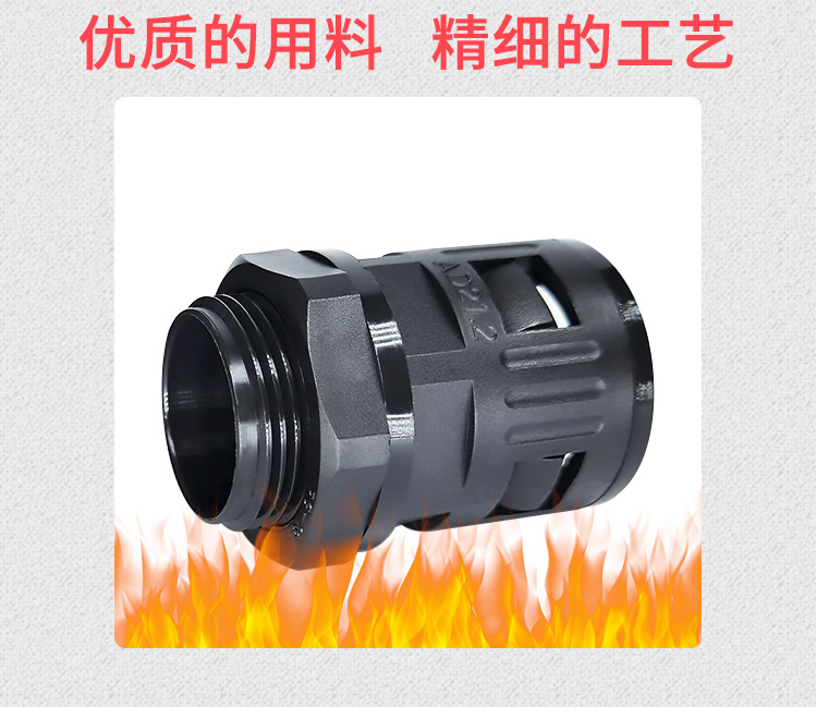 產(chǎn)品材質(zhì):接鍍鋅鋼管部分采用鋅合金壓鑄而成,接塑料波紋管部分,采用UL認(rèn)可之尼龍PA66材料制成。