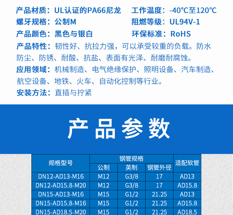 訂貨說(shuō)明:DKN20-AD21.2 代表 一頭接DN20水煤氣厚壁鋼管,另外一頭接AD21.2波紋管。薄壁穿線管需要根據(jù)鋼管外徑 非標(biāo)定制 。產(chǎn)品材質(zhì):接鍍鋅鋼管部分采用鋅合金壓鑄而成,接塑料波紋管部分,采用UL認(rèn)可之尼龍PA66材料制成。
