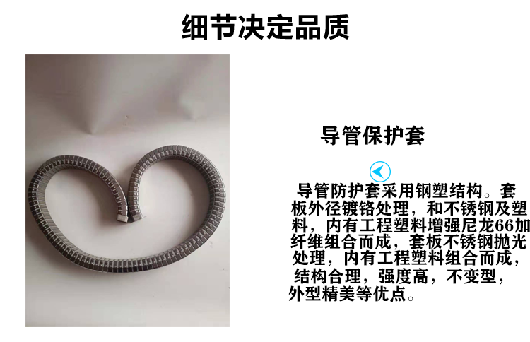 導(dǎo)管防護(hù)套保護(hù)油管*產(chǎn)品采用鋼塑結(jié)構(gòu),套板采用不鋼銹板拋光處理,內(nèi)有工程塑料增強(qiáng)尼龍66加纖維組合而成,具有結(jié)構(gòu)合理,強(qiáng)度高、不變型、外型精美等優(yōu)點(diǎn)。