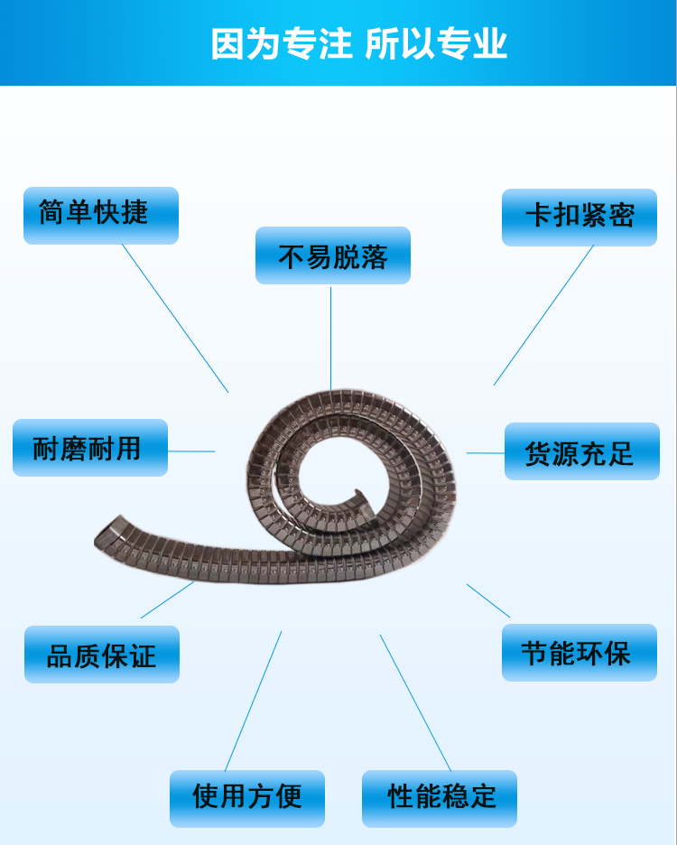 導(dǎo)管防護(hù)套保護(hù)油管*產(chǎn)品安裝方便,適用于各類機(jī)床機(jī)械電氣、生產(chǎn)車間、加工中心、液壓氣動(dòng)管線和裝飾美化主機(jī)造型。確保操作人員勞動(dòng)安全。