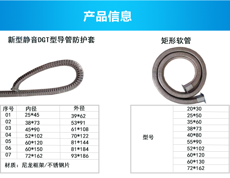 選用正確的接頭。特性說明 DGT型導(dǎo)管防護(hù)套安裝方便,適用于各類機(jī)床機(jī)械電器、液壓汽動(dòng)管線防護(hù),確保操作人員勞動(dòng)安全。