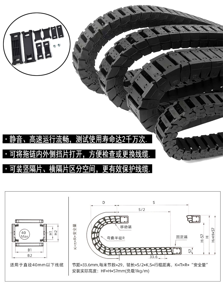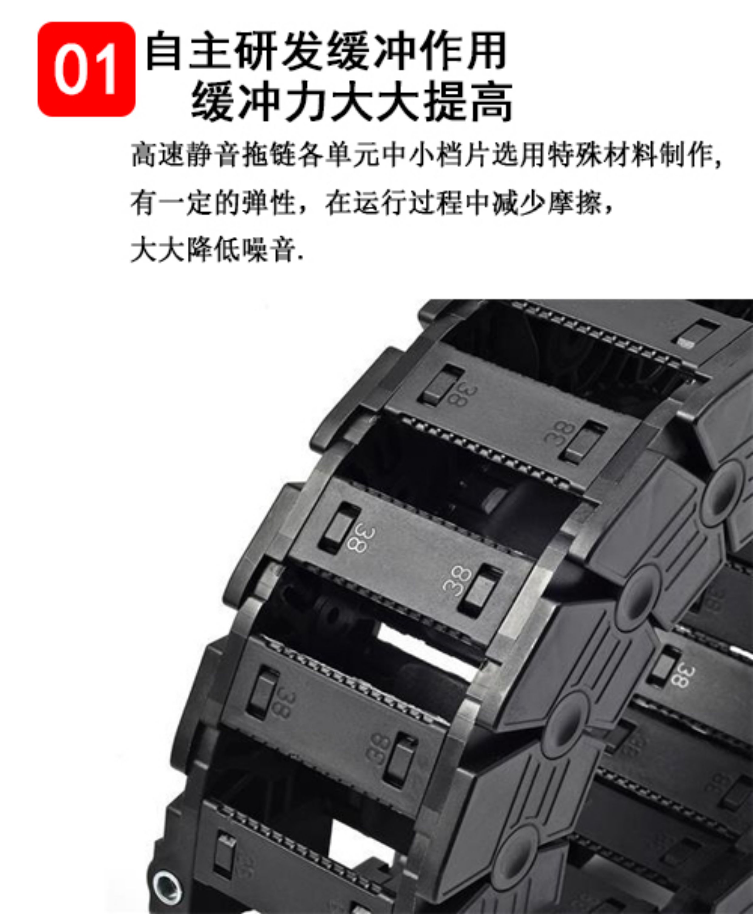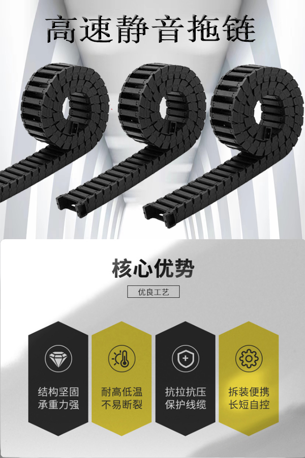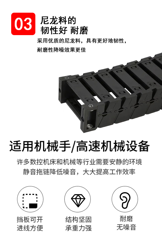 1、材質(zhì):增強尼龍,具有高壓和拉伸載荷,良好的韌性,高彈性和耐磨性,阻燃性,在高溫和低溫下性能穩(wěn)定,可在戶外使用,尼龍的用量決定了阻力的強度和鏈條的耐磨性和可以使用的噪音量。尼龍含量為5%至17%,但超過19%。通常約為30%。