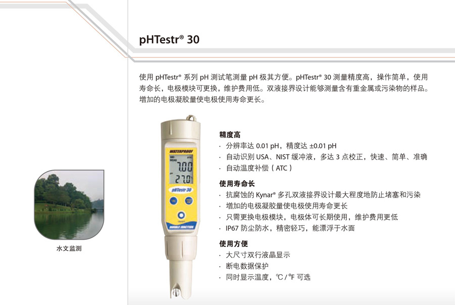Eutech/優(yōu)特防水型pHTestr30測試筆帶ATC和溫度顯示精度±0.01pH