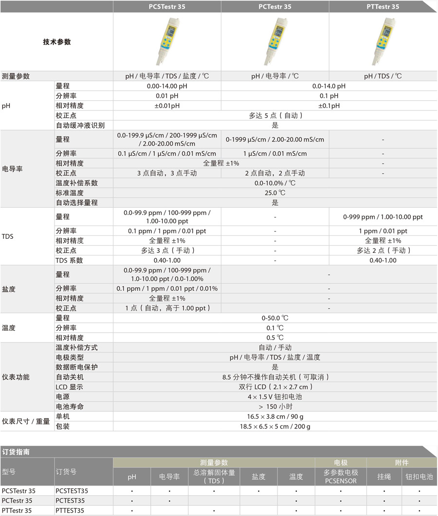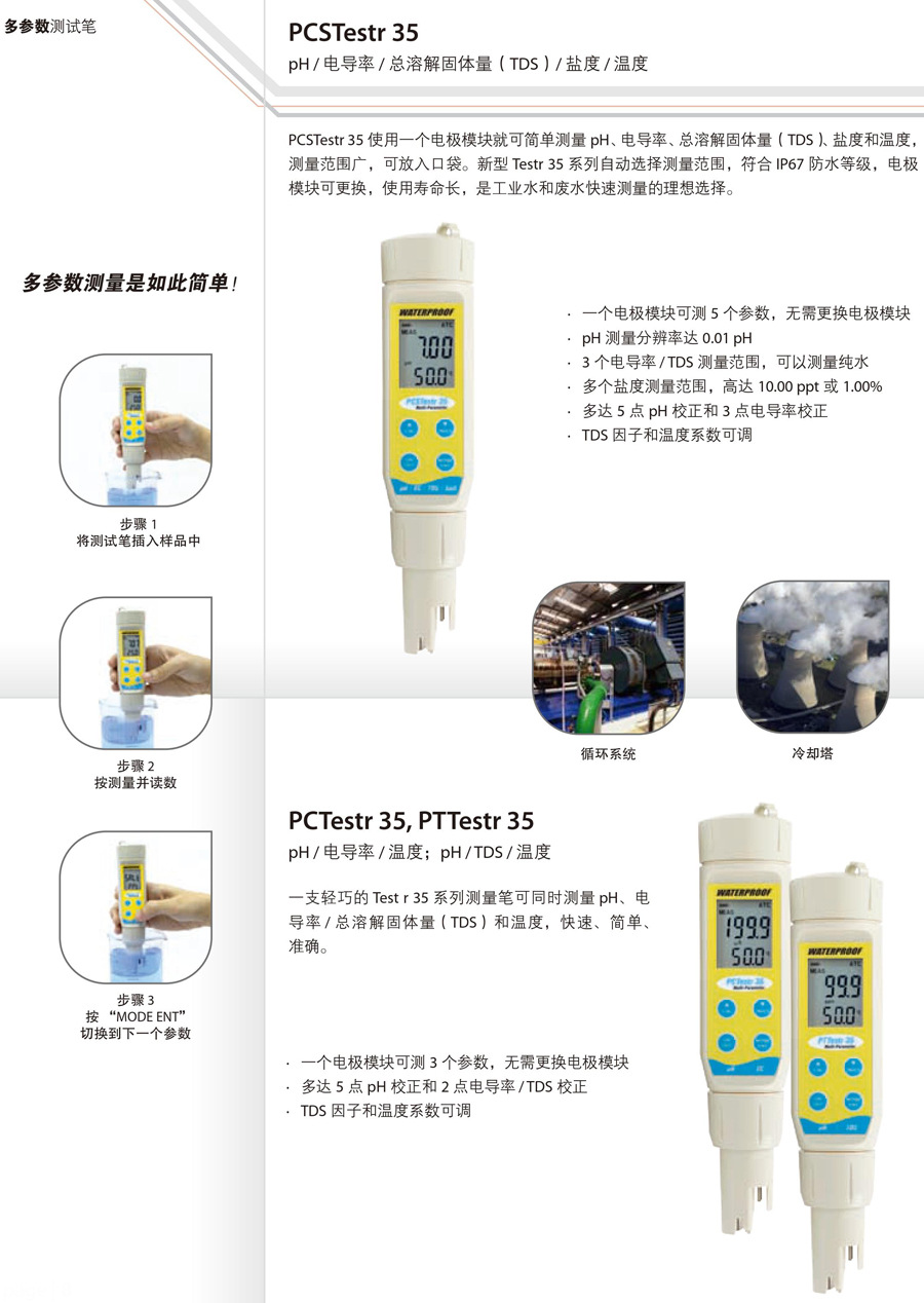 每次切換參數(shù)時(shí)都無需更換傳感器。Eutech? PCTestr 35多參數(shù)袖珍測試儀測量三個(gè)參數(shù)(測量pH,電導(dǎo)率和溫度)。 適用于一般應(yīng)用:適用于游泳池和水療中心,水族館和水培操作中的快速準(zhǔn)確的pH檢查,或者需要經(jīng)常進(jìn)行pH測試的地方。PCSTestr 35符合許多標(biāo)準(zhǔn)環(huán)境和ASTM測試方法的要求。 適用于工業(yè)應(yīng)用:用于冷卻塔,食品加工水測試以及金屬表面處理,照片開發(fā),印刷和化學(xué)工業(yè)中的工藝/廢水測試。 用于教育應(yīng)用:在學(xué)校,許多實(shí)驗(yàn)室應(yīng)用和生態(tài)學(xué)研究中很有用。
