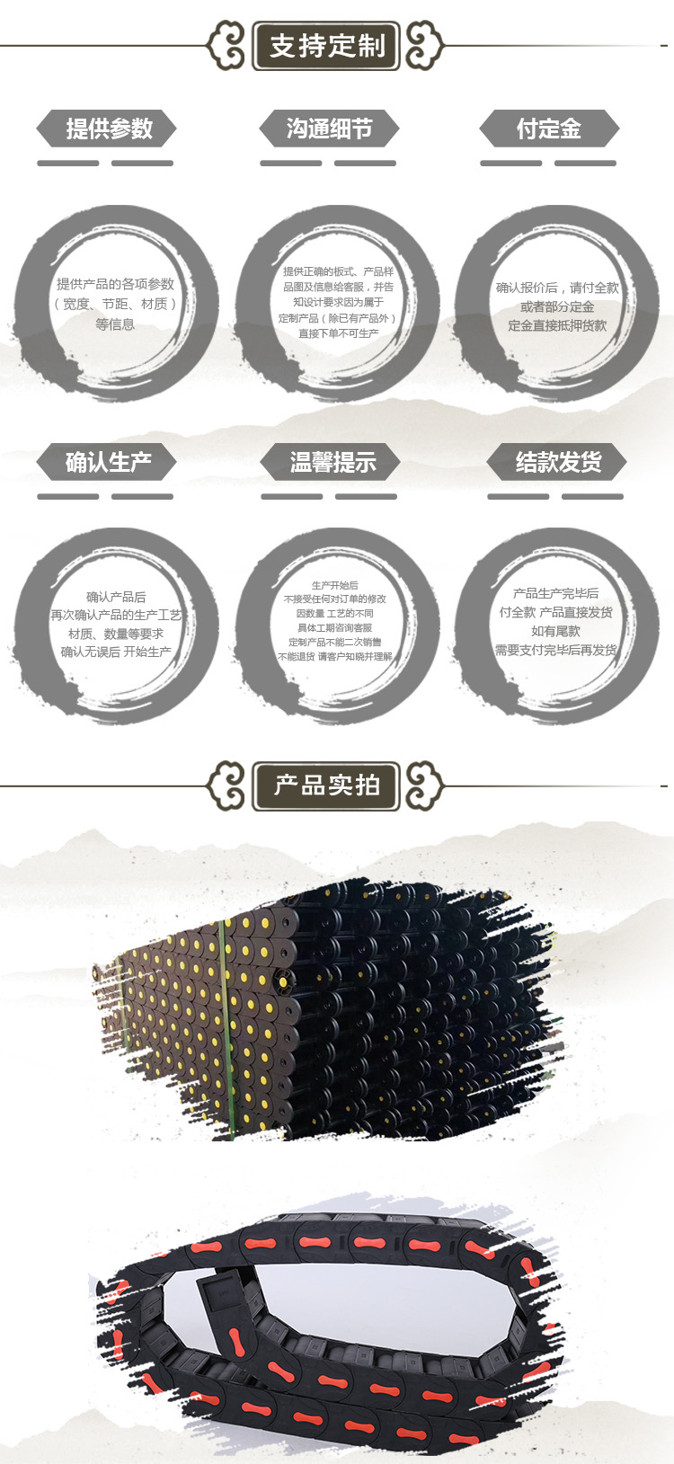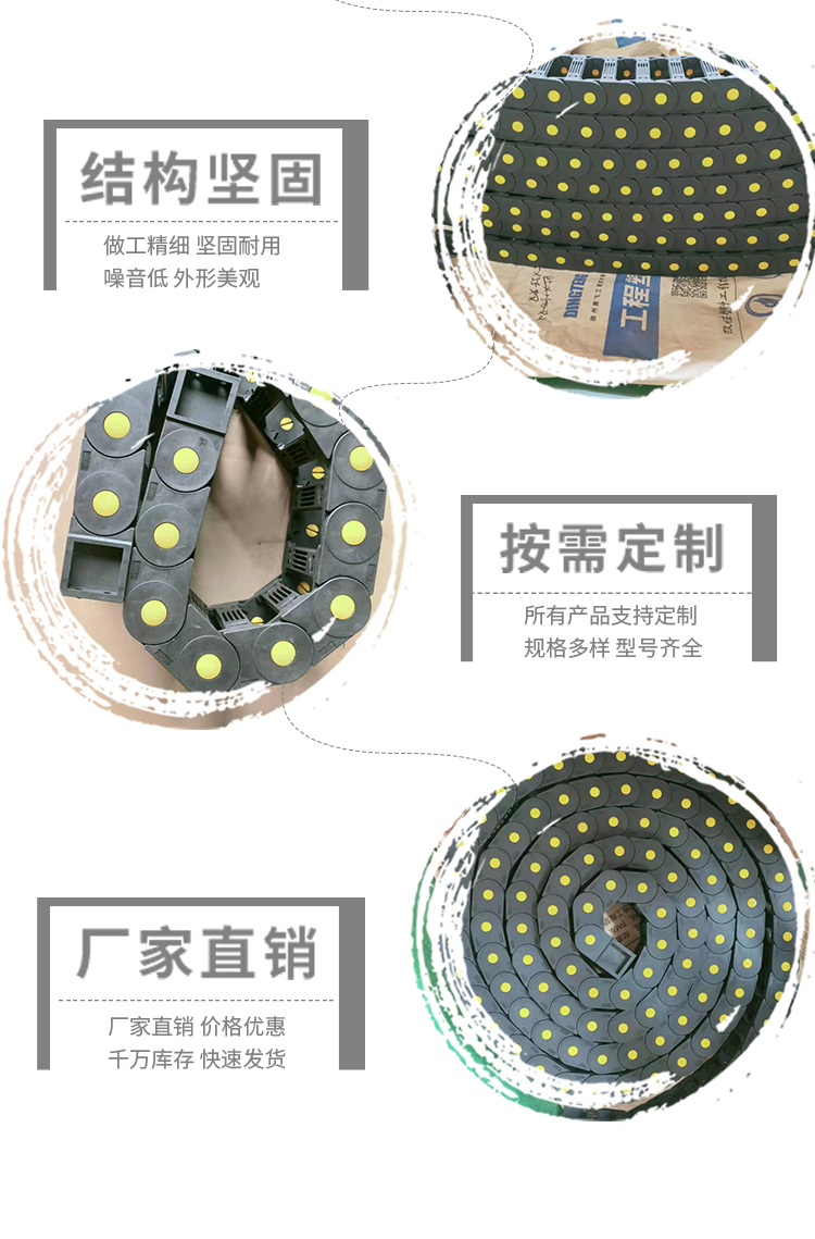 增強(qiáng)尼龍拖鏈采用增強(qiáng)尼龍,具有高的壓力和抗拉負(fù)荷,良好的韌性、高彈性、耐磨性、阻燃性。高低溫時(shí)性能穩(wěn)定,可以使用在室外。