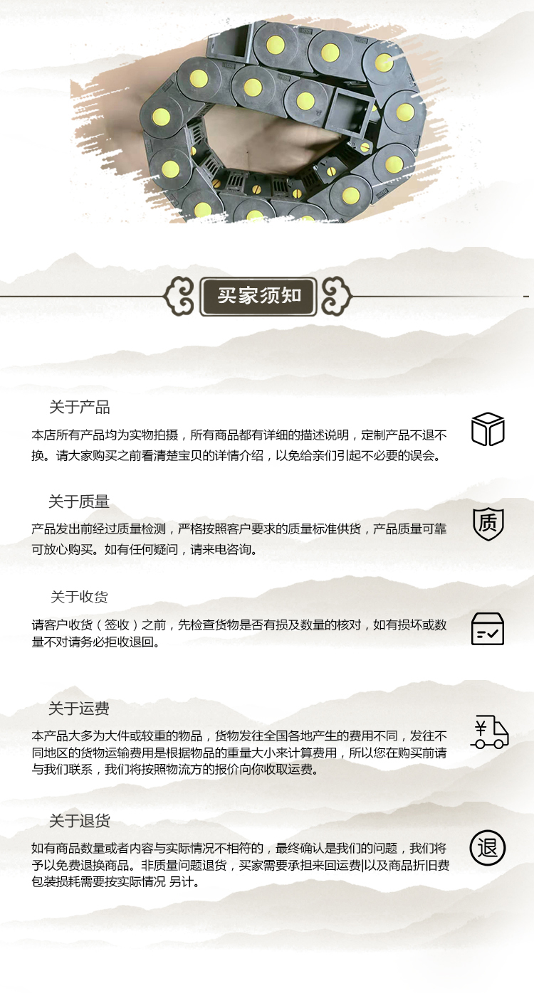 彎曲半徑:選擇內(nèi)置電纜、油管、氣管、水管等中大的彎曲半徑作為參考值,并留有10%以上的空間,拖鏈內(nèi)置電纜、油管、水管、氣管的放置原則。