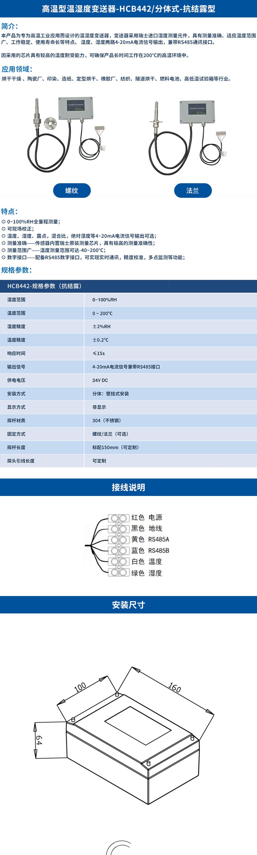 HC/賀琛--HCB442-分體式高溫抗結(jié)露溫濕度變送器工業(yè)溫濕度計(jì)傳感器壁掛螺紋或法蘭