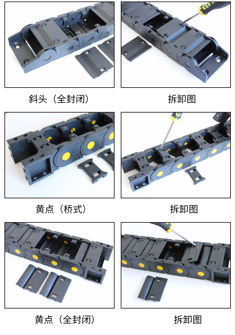 (3)單元鏈節(jié)由左右鏈板和上下蓋板組成,拖鏈每節(jié)都能打開,裝拆方便,不必穿線,打開蓋板后即可把電纜、油管、氣管、水管等放入拖鏈。