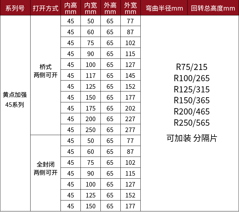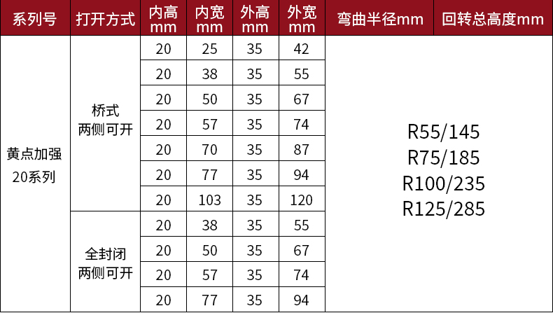 (2)相同系列的拖鏈的內(nèi)高、外高、節(jié)距相同,拖鏈內(nèi)寬、彎曲半徑R可有不同的選擇。