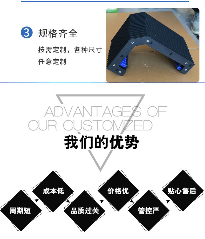 2、風(fēng)琴式防護(hù)罩行程長,壓縮小,長度的比值為1:10;