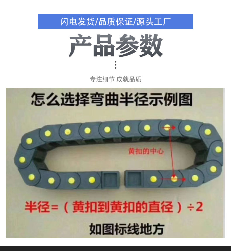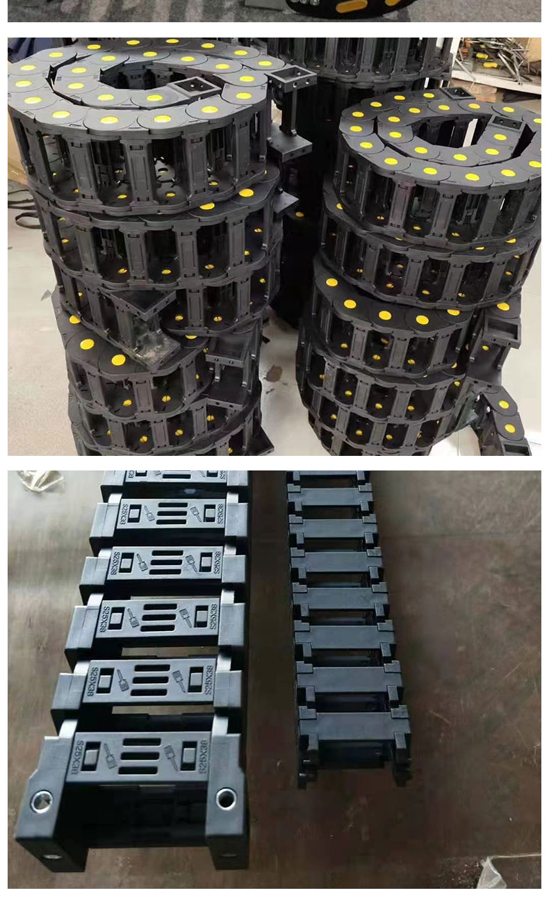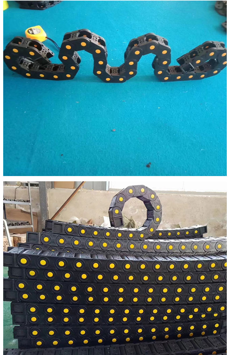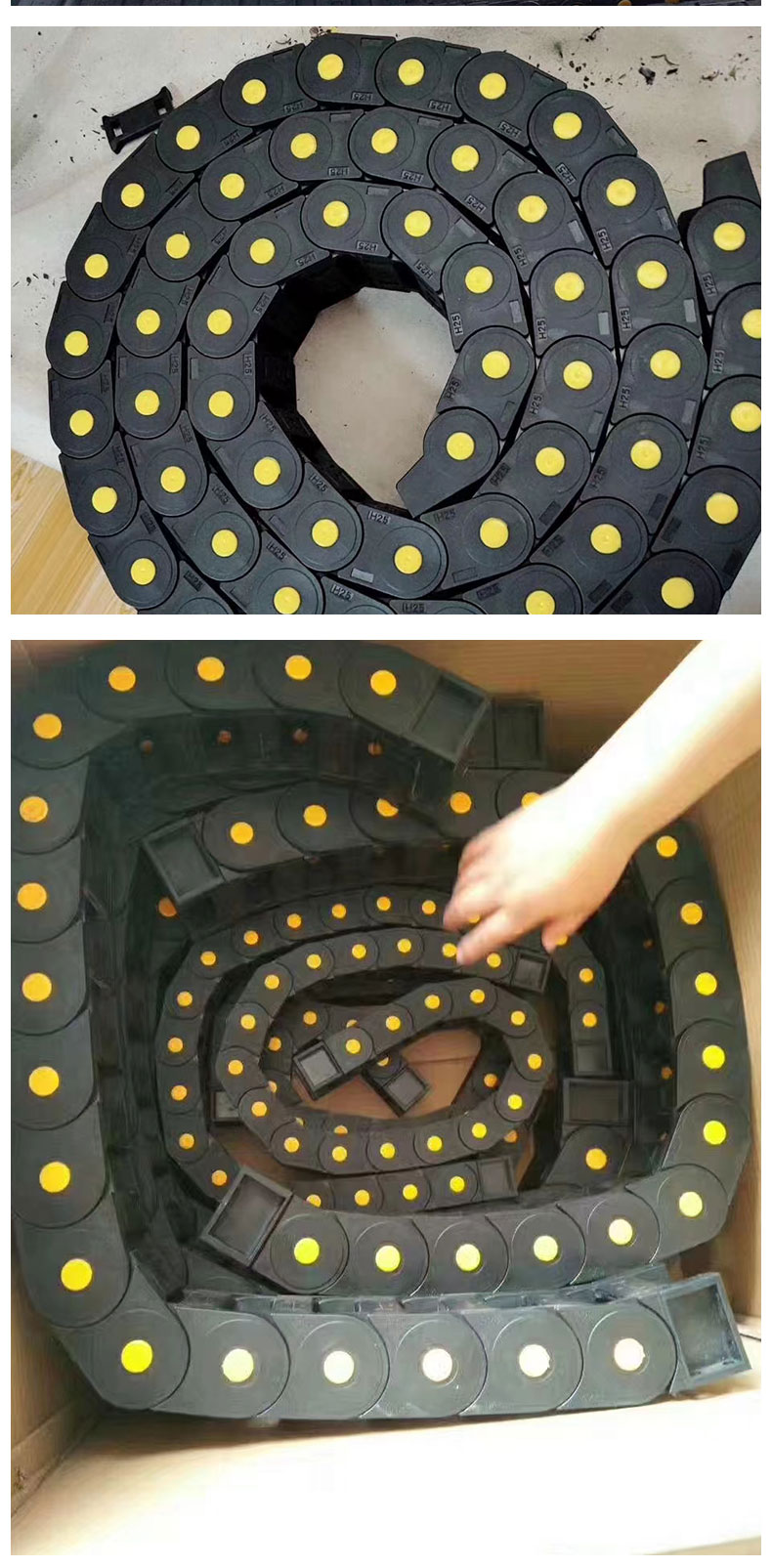 選擇內(nèi)置電纜,油管,氣管,水管等中zui大的彎曲半徑作為參考值,并留有10%以上的空間。拖鏈放置時應(yīng)該留有15%的剩余空間,讓內(nèi)置電纜,油管等可以 量平均分布,必要時可用分隔片分開。在高速或高頻率運行時,要盡量使導(dǎo)線在水平上相互分開,不要使之相互疊置,在電纜,氣管,油管等較多的時候建議使用分隔片。