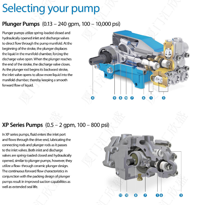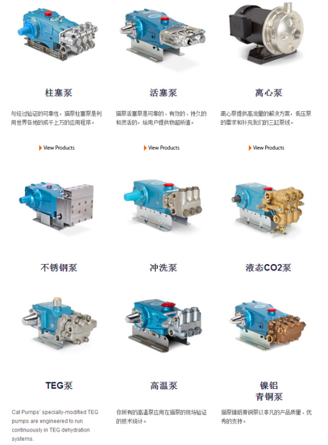 CAT PUMPS三柱塞高壓泵用于連續(xù)工作的應(yīng)用場(chǎng)合。CAT PUMP是抽取無(wú)磨料(無(wú)顆粒)液體、中等PH液體介質(zhì)的理想液體泵,其抽取的液體介質(zhì)包含城市供水、過(guò)濾后的廢水、油料、清潔溶液、殺蟲(chóng)劑、化學(xué)品溶液、海水、去離子水等,在制藥和食品制造上也在使用。