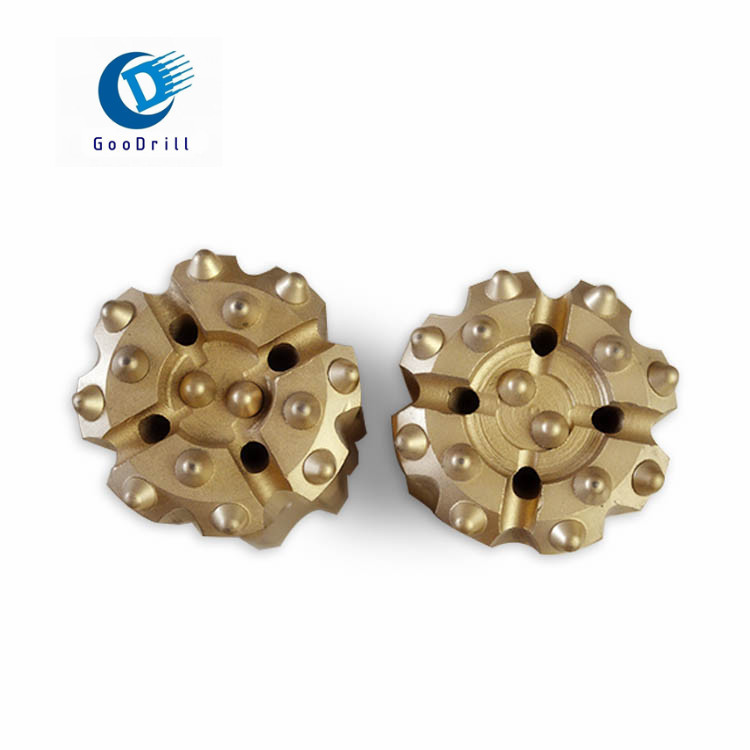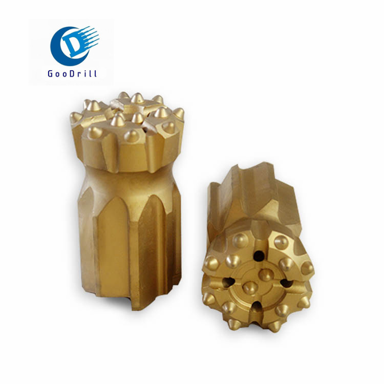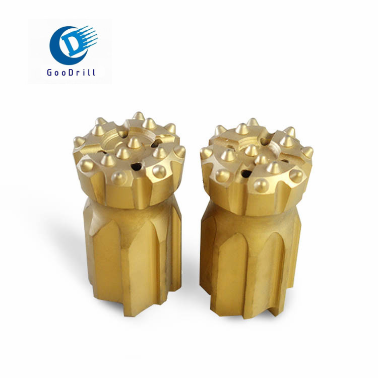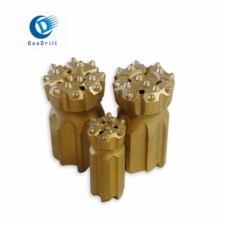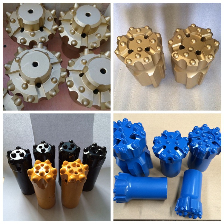 球齒鉆頭有螺紋連接的和錐孔連接兩種,前者主要是與液壓鑿巖機(或風動鑿巖機)及液壓釬桿(風動釬桿)配套使用的一種鉆頭,通過不同形式的螺紋與釬桿配合,進行鑿孔作業(yè),而后者是與風動鑿巖機及錐度桿配套使用的一種鉆頭,通過錐度與釬桿聯(lián)接,進行鑿孔作業(yè),都具有良好的排粉效果并且破碎能力強,鑿巖速度快,便于修磨。