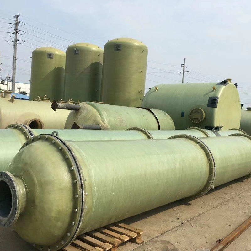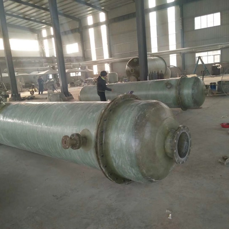 為玻璃鋼整體纏繞的圓筒型塔體,無分段連接法蘭。具體結(jié)構(gòu)由壓力室、貯液箱、填料、噴淋裝置、除沫裝置等組成。