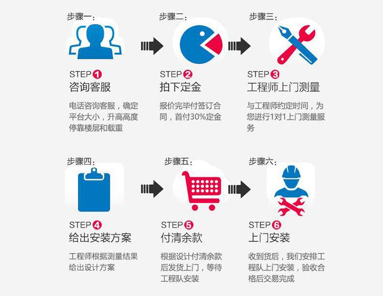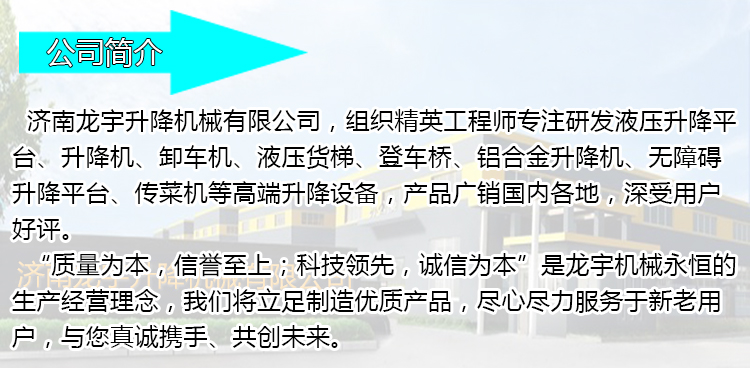 主營(yíng)產(chǎn)品: 登車(chē)橋, 液壓升降貨梯, 固定剪叉式升降機(jī), 移動(dòng)剪叉式升降平臺(tái), 鋁合金升降平臺(tái), 曲臂式高空作業(yè)平臺(tái), 全自動(dòng)升降機(jī), 傳菜梯, 無(wú)障礙升降平臺(tái)