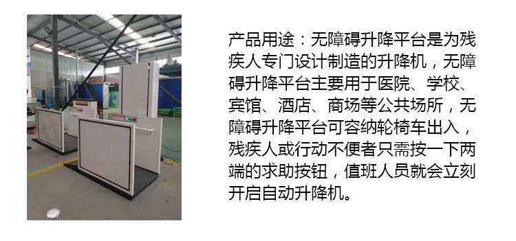 殘疾人升降機(jī)也叫無(wú)障礙升降平臺(tái),為方便殘疾人出行及觀光,在社區(qū),醫(yī)院,學(xué)校,賓館,酒店,公共場(chǎng)所等地方。旅游觀光梯通道的自動(dòng)扶梯旁,安裝了無(wú)障礙升降機(jī)。無(wú)障礙升降機(jī)可容納輪椅車(chē)出入,殘疾人或行動(dòng)不便者只需按一下兩端的求助按鈕,值班人員就會(huì)立刻開(kāi)啟自動(dòng)升降機(jī)。