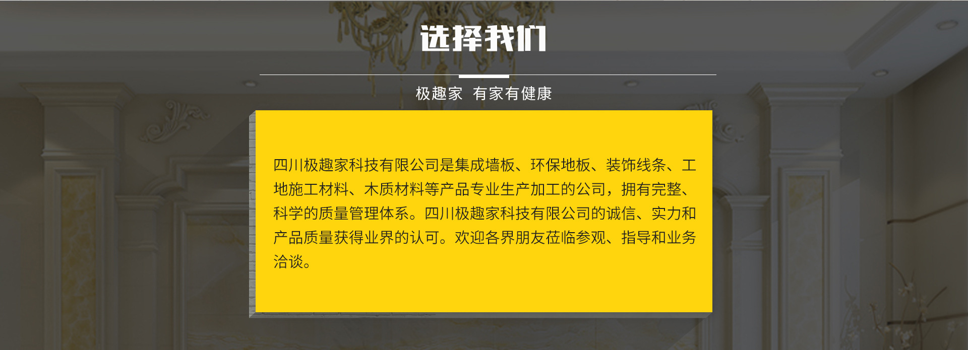 極趣家成都華偉木塑裝飾有限公司品牌隸屬于四川極趣家科技有限公司華偉木塑現(xiàn)擁有先進(jìn)集成墻面生產(chǎn)設(shè)備20余條,年產(chǎn)量達(dá)8000噸以上,憑借著先進(jìn)的設(shè)備,雄厚的技術(shù)力量,完善的管理,先進(jìn)的服務(wù),現(xiàn)已發(fā)展成為擁有擠塑、轉(zhuǎn)印、覆膜、UV加工技術(shù)集一體的生產(chǎn)企業(yè)。是一家專業(yè)致力于生產(chǎn)環(huán)保生態(tài)木、木塑線條、實木線條的廠家。產(chǎn)品系列有:大小長城板、單板、寬板(快裝板)、吊頂天花、造型方通、集成墻面墻板、隔斷墻板、踢腳線、木屋材料、各種配套裝飾線條。