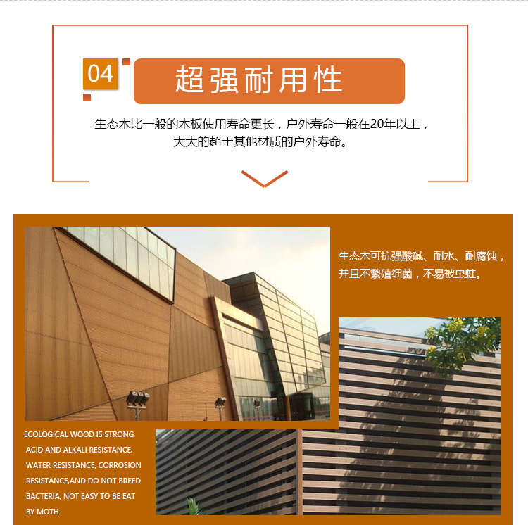2.穩(wěn)定性---產(chǎn)品抗老化、防水、防潮、防霉、防腐、防蟲蛀、防白蟻、有效阻燃、耐候性、抗老化性和保溫隔熱節(jié)能性,可長(zhǎng)期使用于氣候形態(tài)變化大的戶外環(huán)境中,而不變質(zhì)、不脆化、性能不衰。
